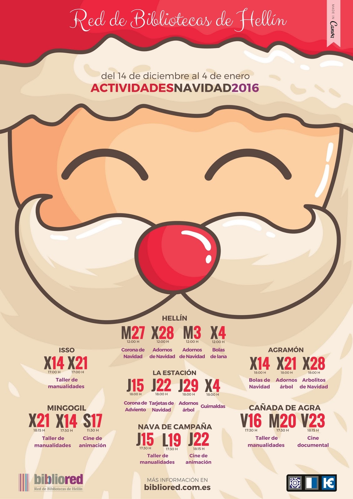Del 14 de diciembre al 4 de enero la Red de Bibliotecas de Hellín ha organizado diversas actividades en todas sus bibliotecas.               Tendremos talleres de manualidades, talleres de navidad  y proyecciones de cine.