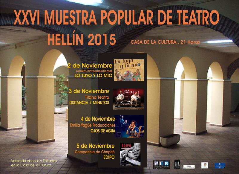 Ya se puede consultar la Programación Cultural Otoño 2015. El Salón de Actos de la Casa de la Cultura de Hellín acogerá una vez más espectáculos para todos los gustos y todas las edades: teatro familiar con “Historias de Martín”, “María Sarmiento” y “Un elefante en mi lavadora” , música con Natural Funk y Sheila Blanco; la reconocida cuentacuentos Coralia Rodríguez, narradora cubana y la esperada XXVI Muestra Popular de Teatro de Hellín con las siguientes obras: “Lo tuyo y lo mío”, “Distancia siete minutos”, “Ojos de agua” y “Edipo”.