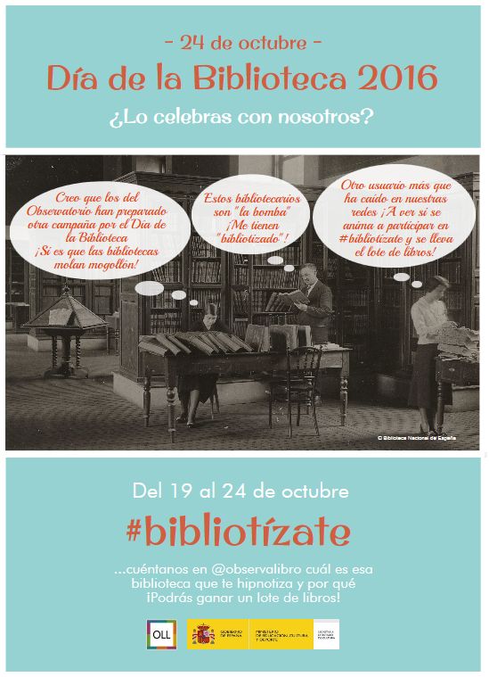 Con motivo del Día de la Biblioteca que se celebra el próximo 24 de octubre, el Observatorio de la Lectura y el Libro lanza en Twitter la campaña “Bibliotízate”, con el objetivo de que, al menos durante los días que esté activa la iniciativa, hagamos un pequeño homenaje a las bibliotecas y a los bibliotecarios.