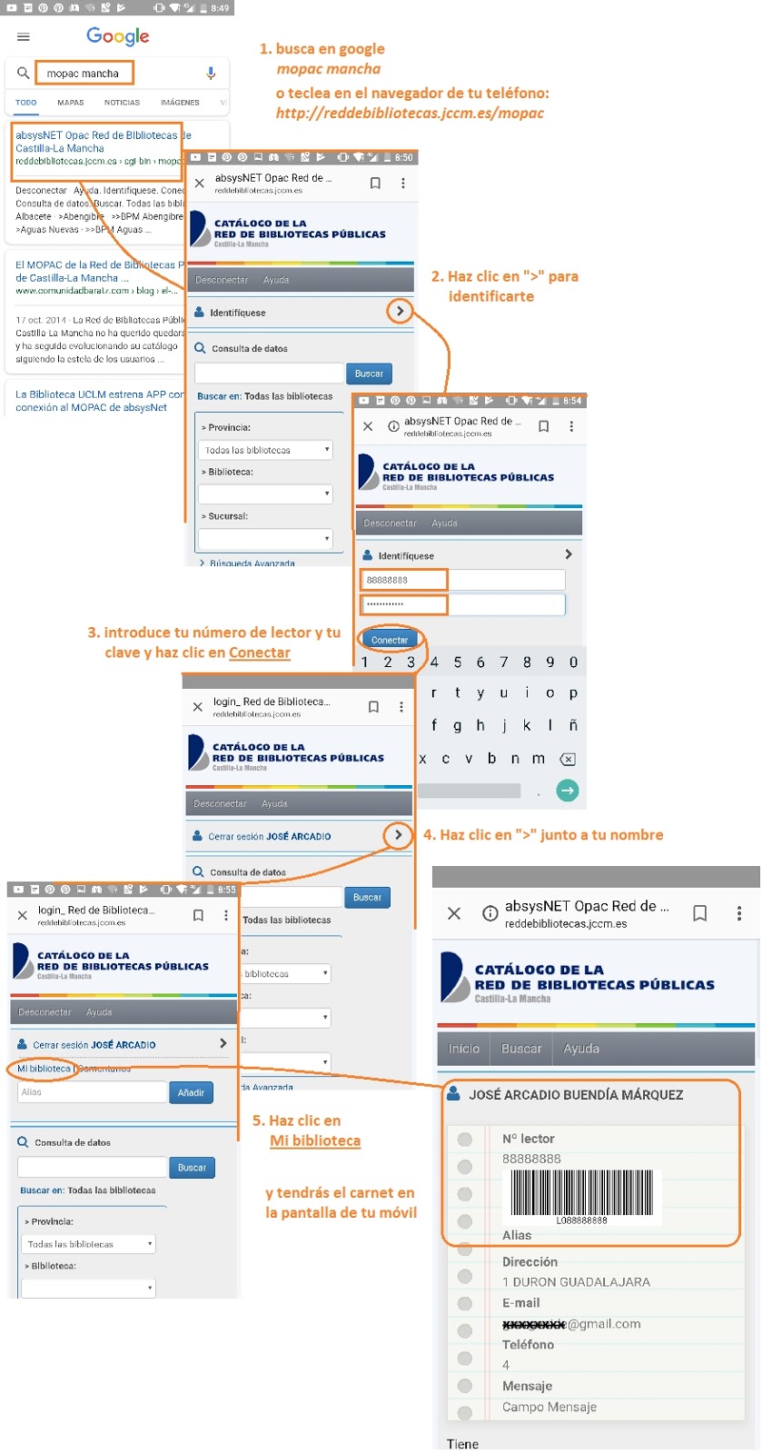 Accede a la página de la Red de Bibliotecas de Castilla -La Mancha, entra en el Catálogo y regístrate con tu usuario y contraseña, pincha en Mi biblioteca y ahí tienes tu carné.