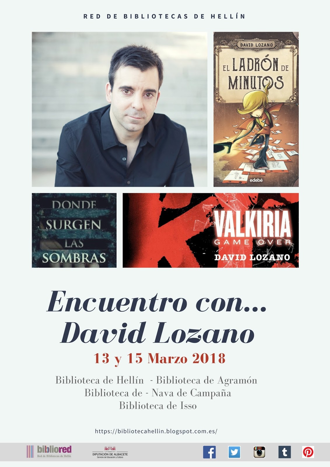 El martes 13 de marzo, en la Biblioteca de Hellín y el jueves 15 de marzo en las bibliotecas de Agramón, Nava de Campaña e Isso tendremos varios Encuentros con el autor de literatura juvenil David Lozano.