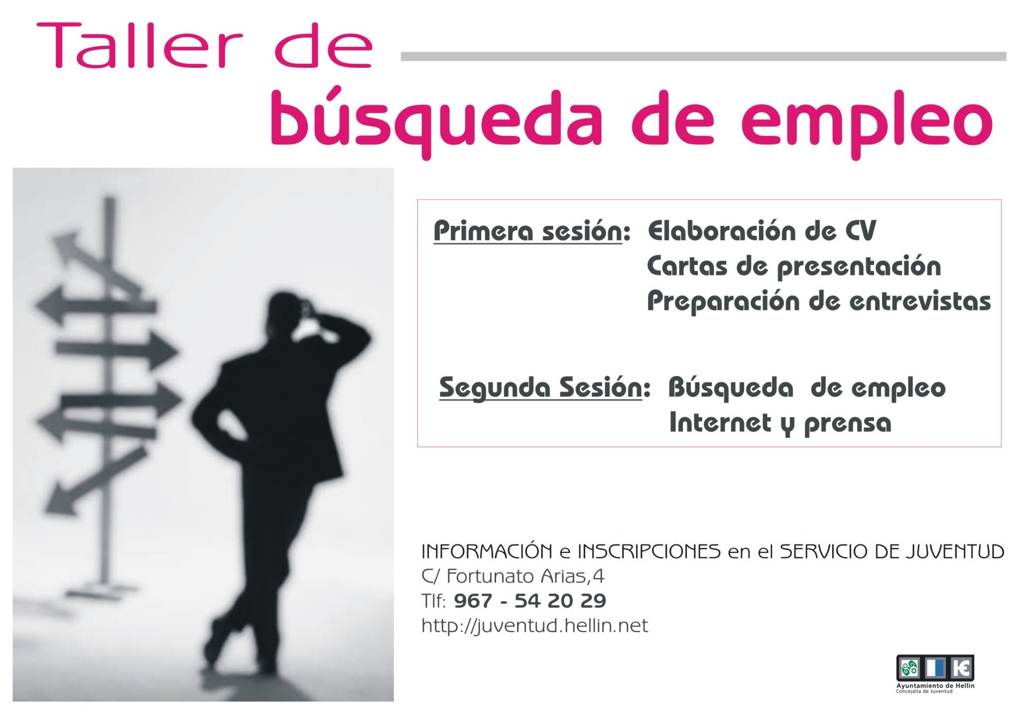 El Centro Joven de Hellín organiza un taller gratuito de búsqueda de empleo. Constará de dos sesiones y en la primera se enseñará a elaborar un Curriculum Vitae, redactar cartas de presentación y preparar entrevistas de trabajo. La segunda sesión está orientada a la búsqueda de empleo, en Internet y en prensa. Es necesario inscribirse en el Servicio de Juventud (c/ Fortunato Arias, 4)