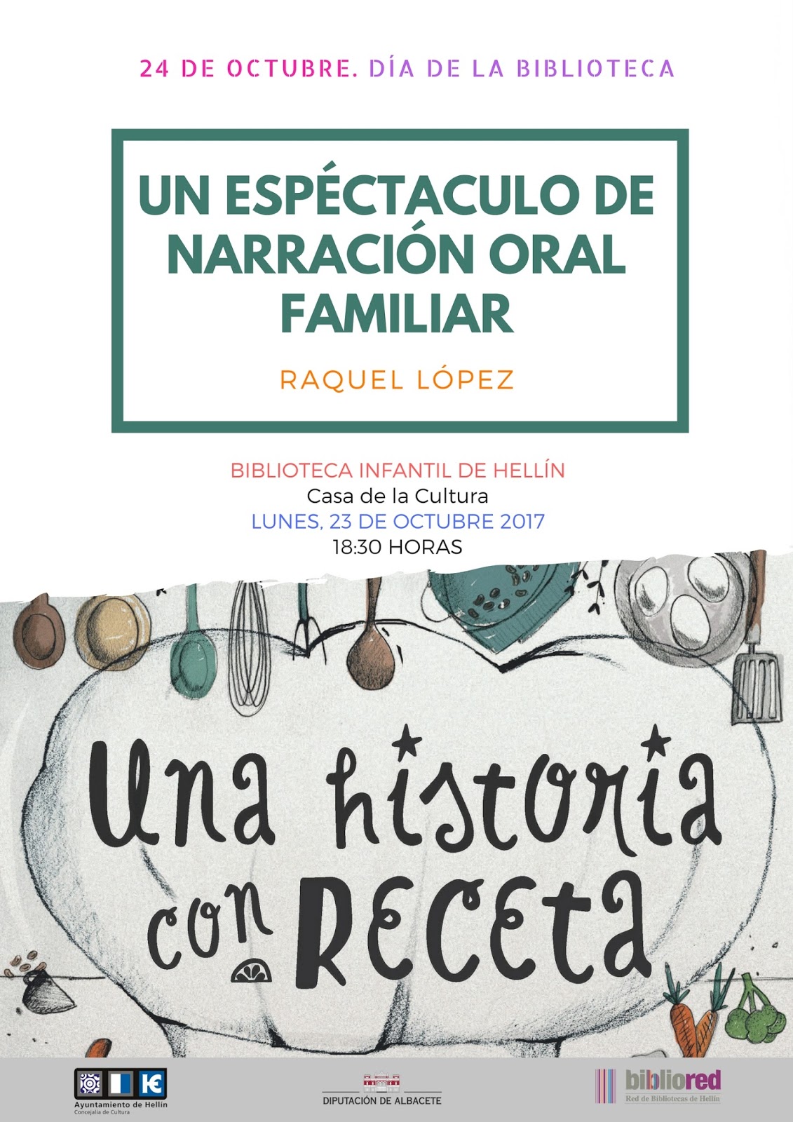 El 23 de octubre a las 18:30 h. la Red de Bibliotecas de Hellín conmemorará el Día de la Biblioteca con una actividad de carácter familiar en la Biblioteca Infantil de la Casa de la Cultura, “UNA HISTORIA CON RECETA“ de Raquel López.